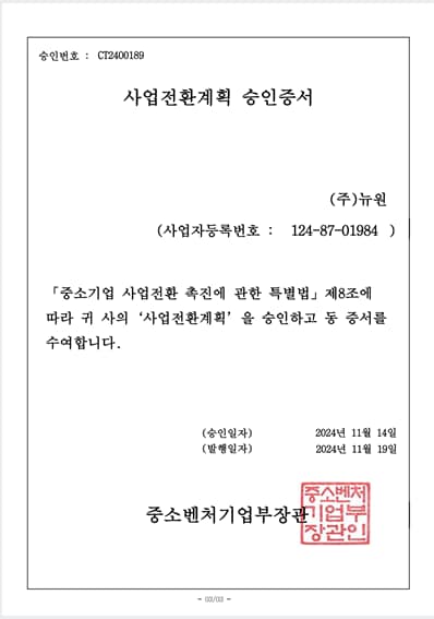 (주)뉴원 중소벤처기업부 사업전환계획 승인