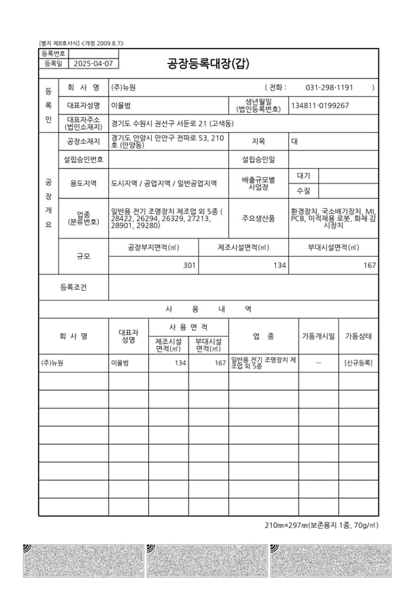 2025년 4월 8일 뉴원 안양공장 공장등록대장